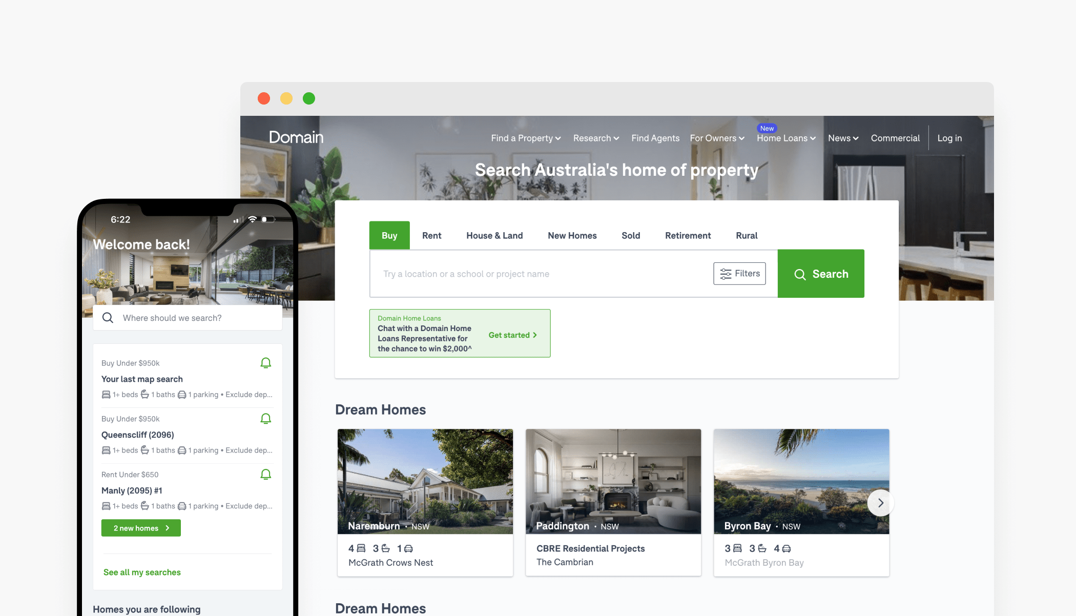In 2020, Domain underwent a rebrand, but the updated brand guidelines had yet to be applied to the product. When we began redesigning and rebuilding the Domain mobile app, we saw this as the perfect opportunity to bring the refreshed identity into the product experience—modernising the UI, aligning app and web platforms, and building the foundations for a unified design system.