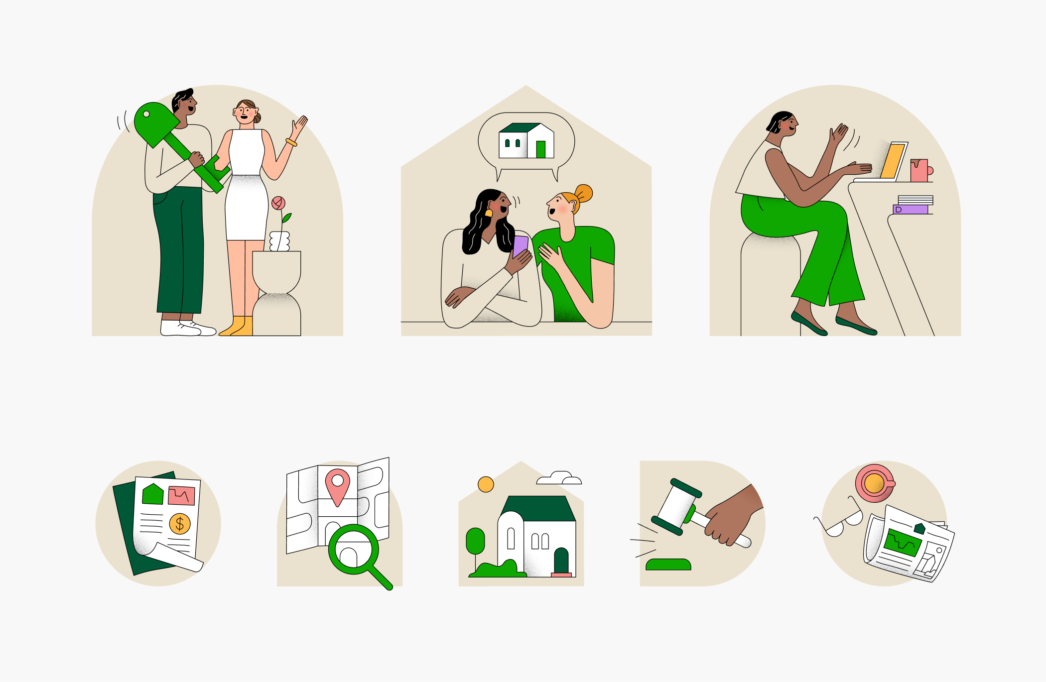 Domain’s logo is made up of four portal shapes. We brought these into the UI to frame imagery, inspire iconography, and guide illustration styling—subtly reinforcing brand recognition without being intrusive.