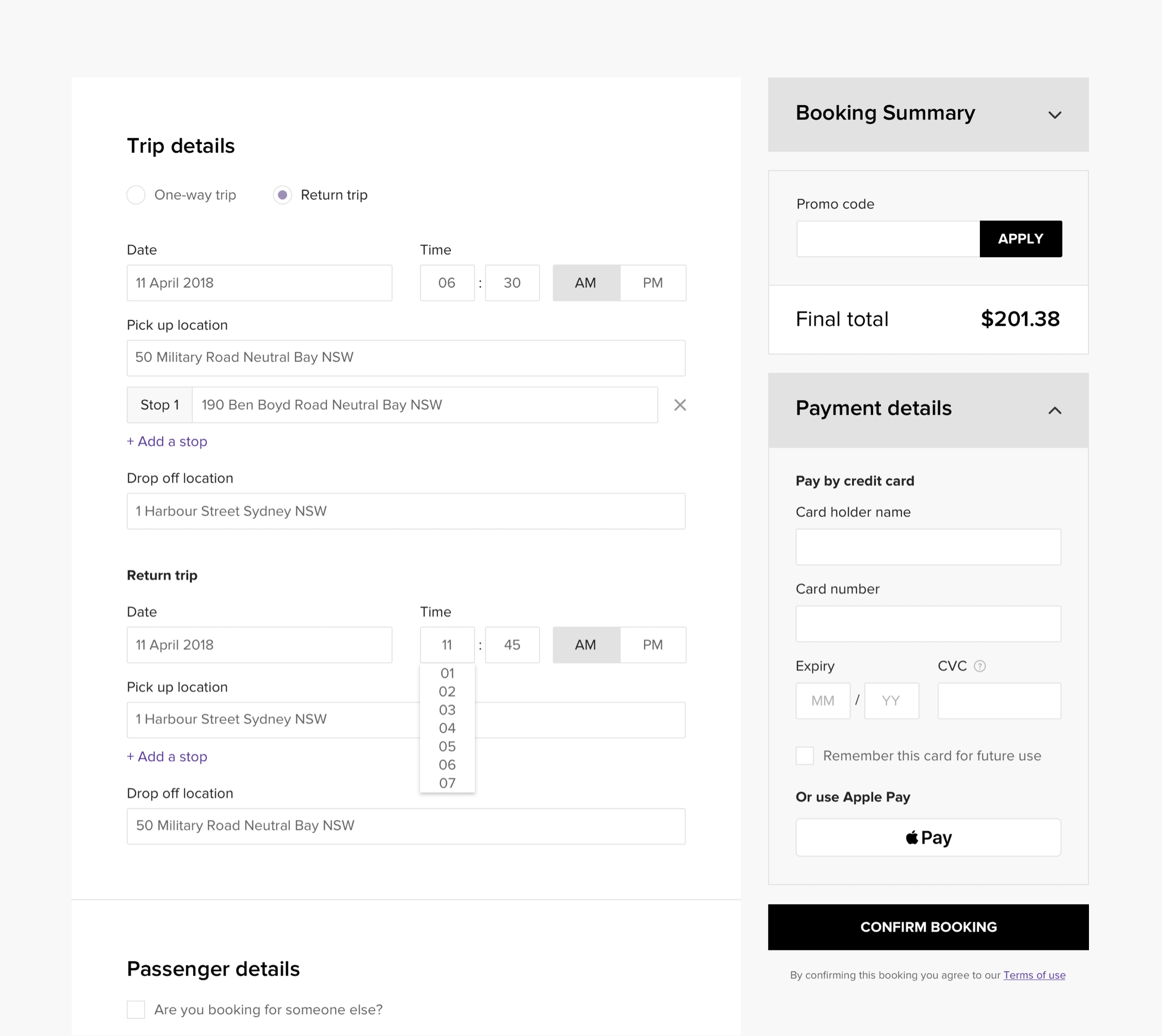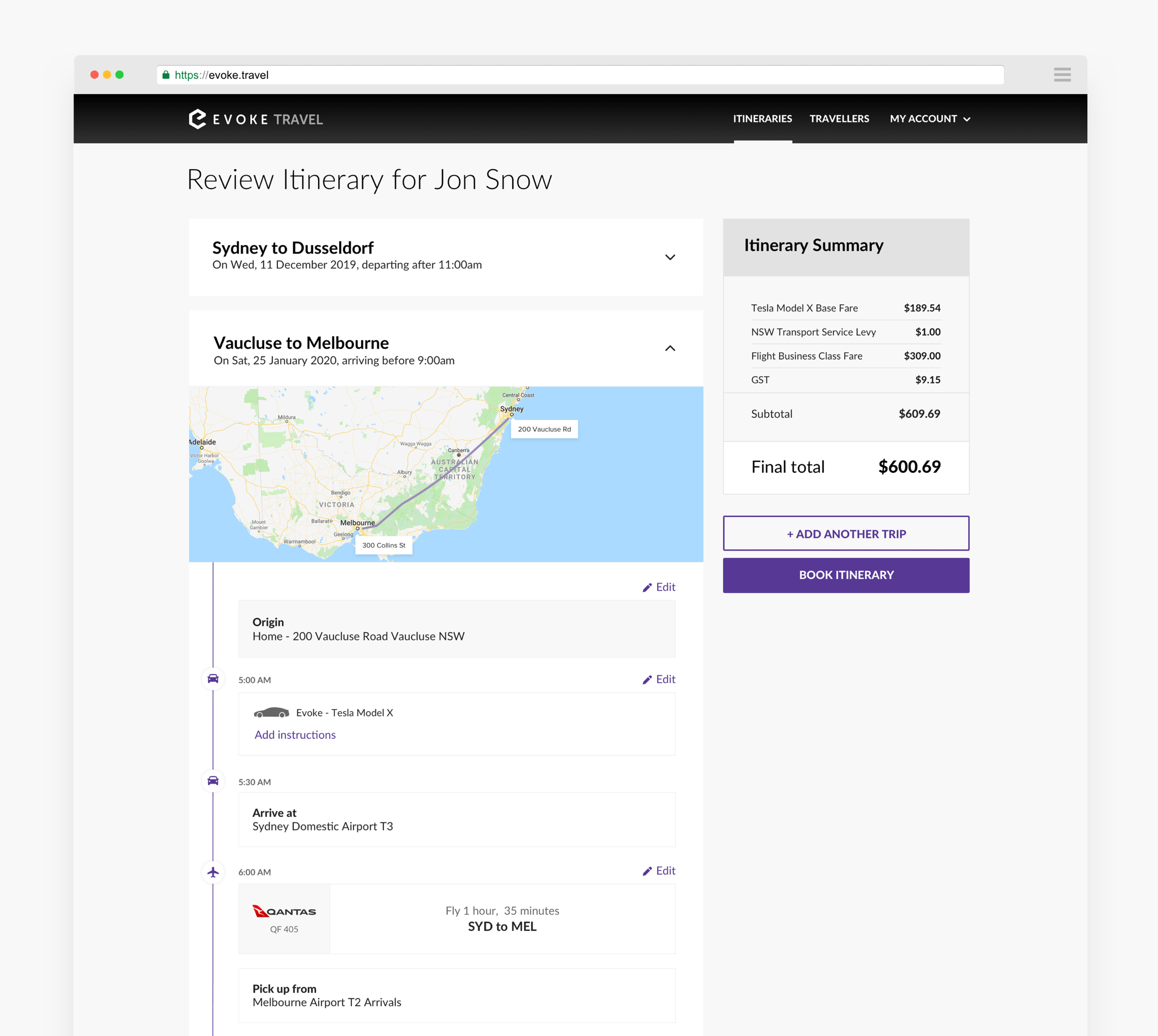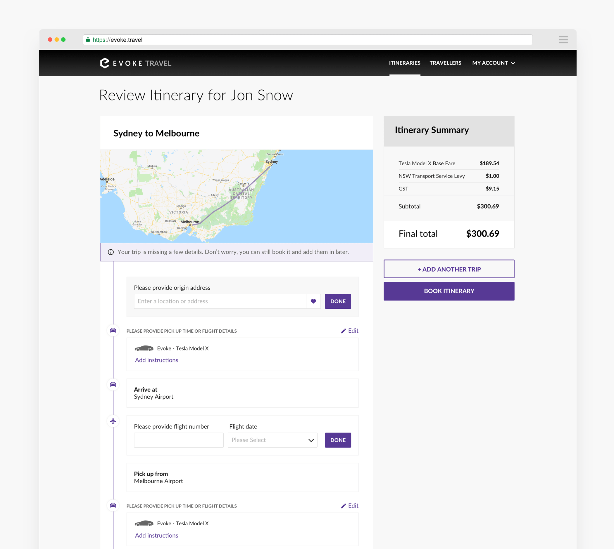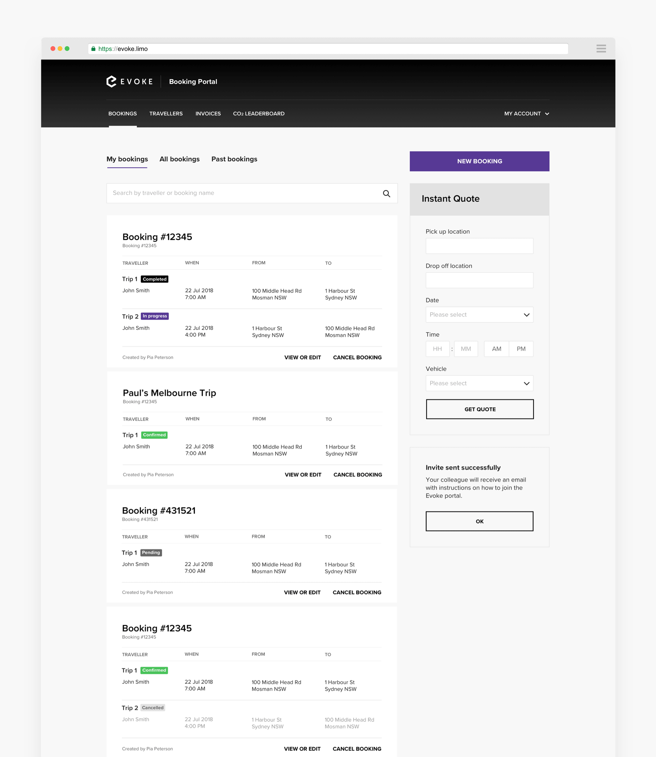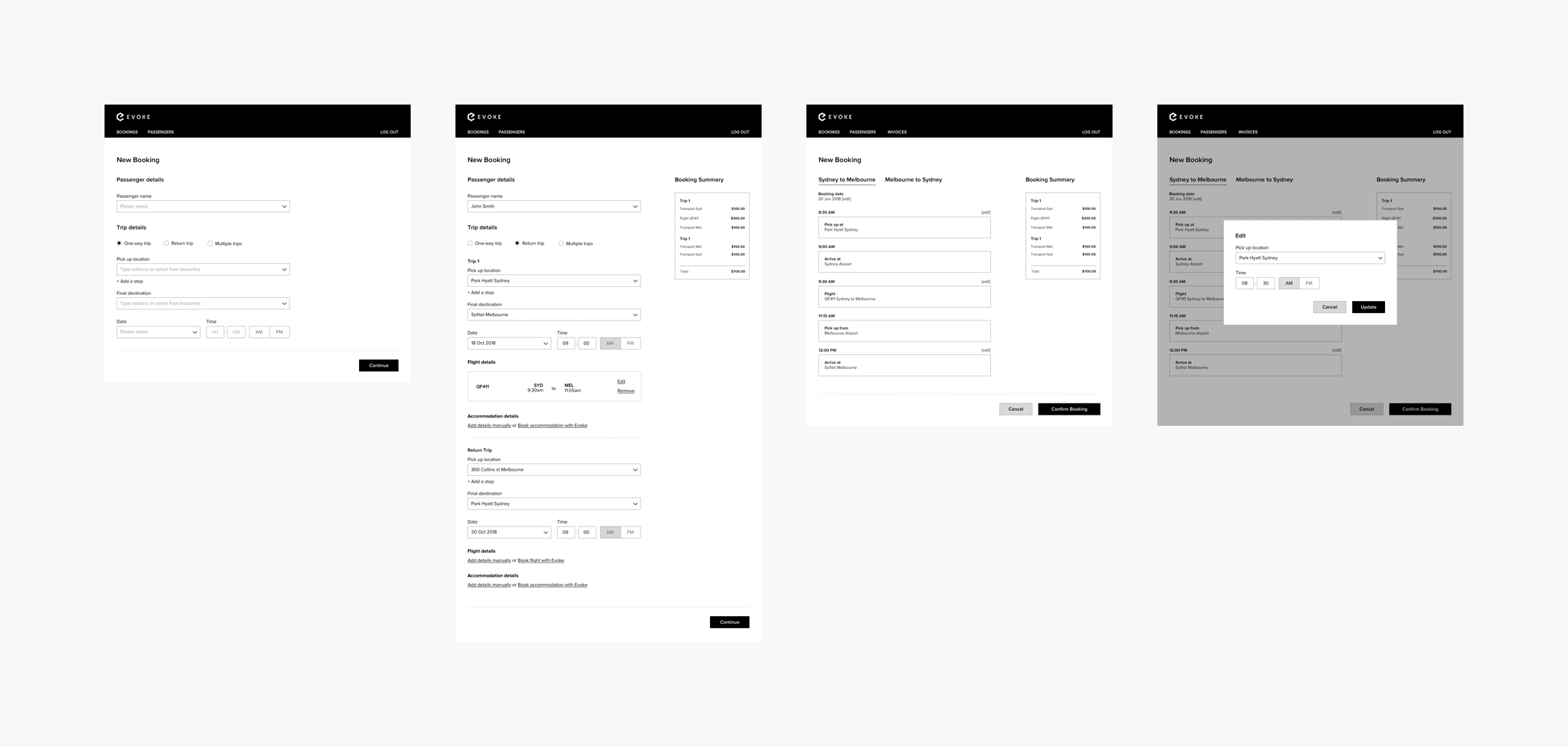 I helped Evoke design a booking platform that allows customers to create, edit and cancel ground transport bookings easily for multiple travellers. Other features include viewing the driver details and car location (within one 1h of the booking time) and the ability for EA’s to share traveller profiles with colleagues in the event they are away, so someone else can manage that person’s travel requirements.
