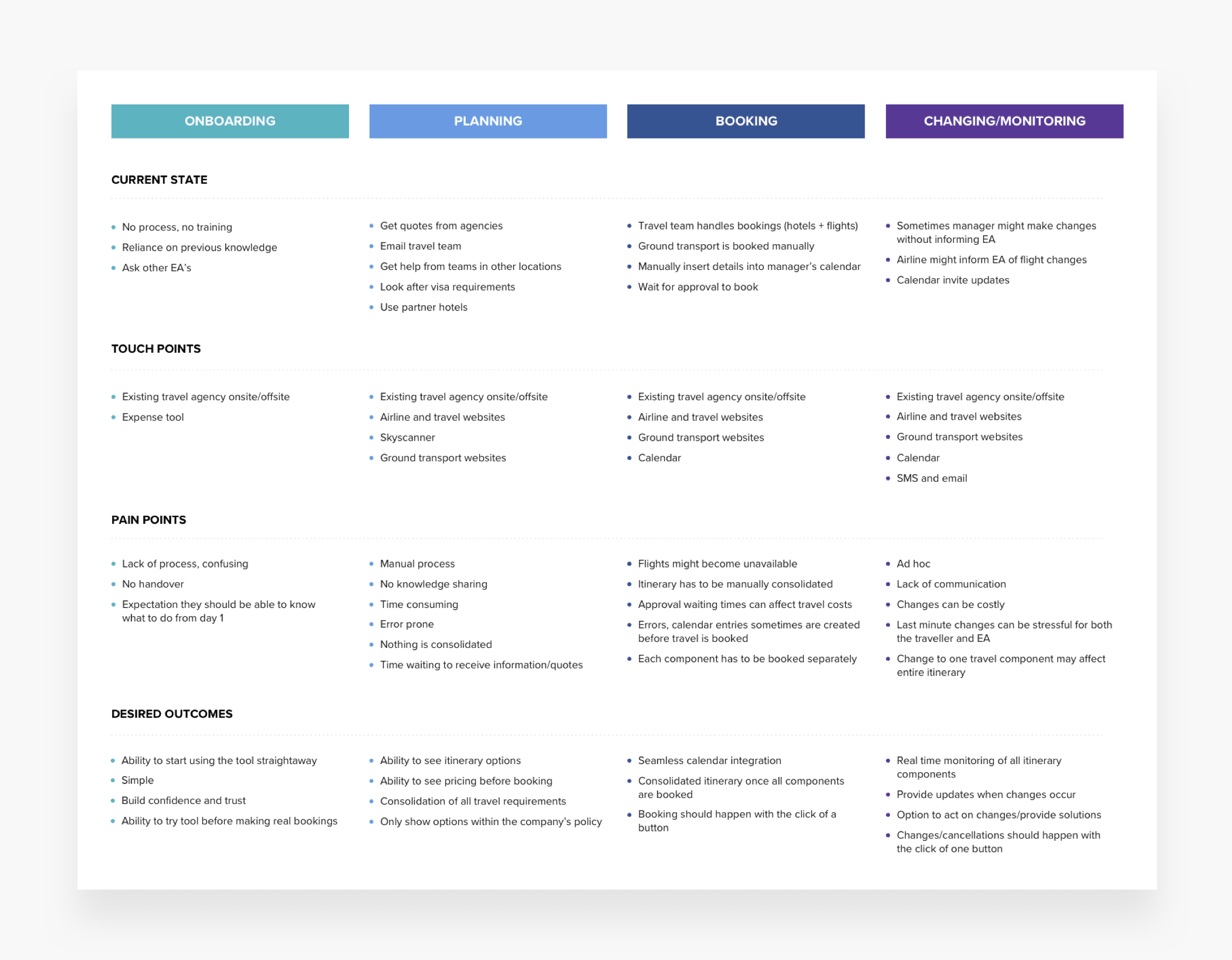 Using the research insights we identified the different stages in the user’s journey: Onboarding, planning, booking, changing/monitoring. I then moved on to creating a customer journey map, outlining the current state, pain points and future goals.