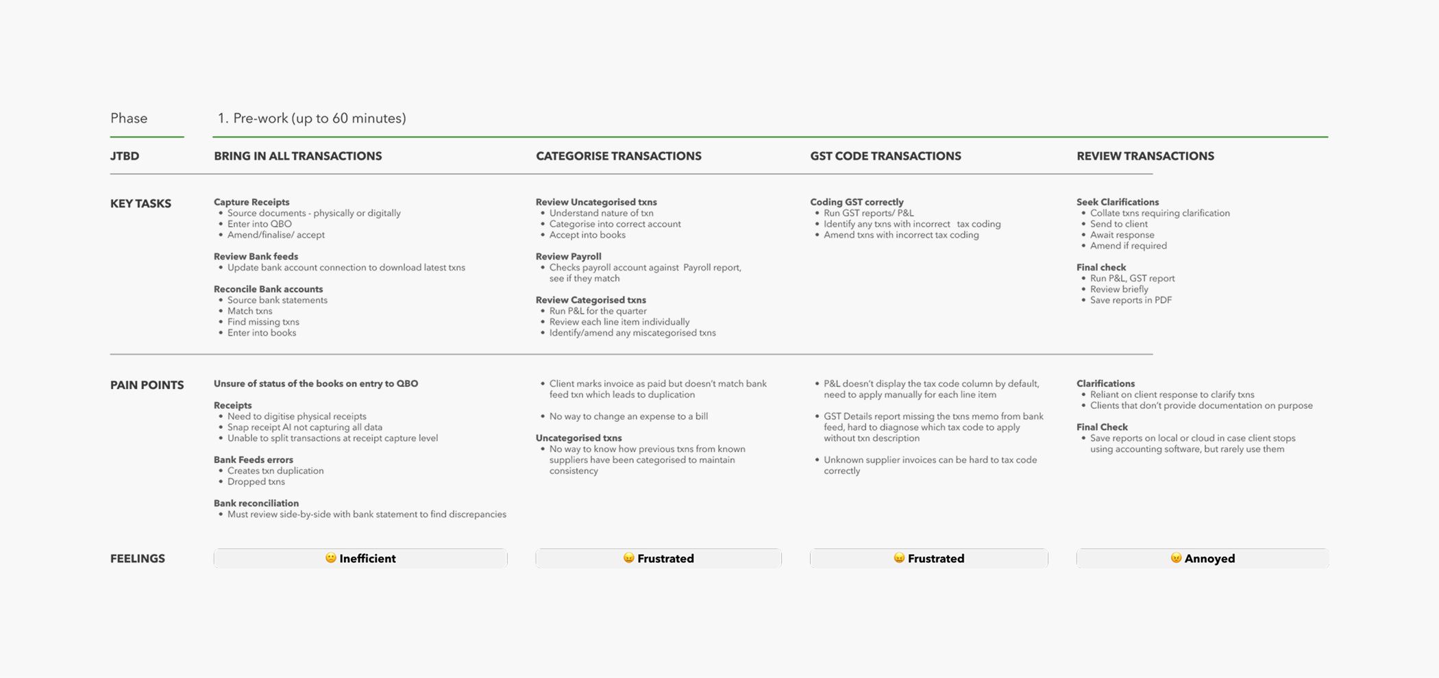 We learned that the BAS preparation journey is highly fragmented, requiring advisors to use multiple disconnected tools and systems to complete each job. This includes external platforms as well as switching between various features within QuickBooks itself, leading to inefficiencies, context switching, and a higher risk of errors.